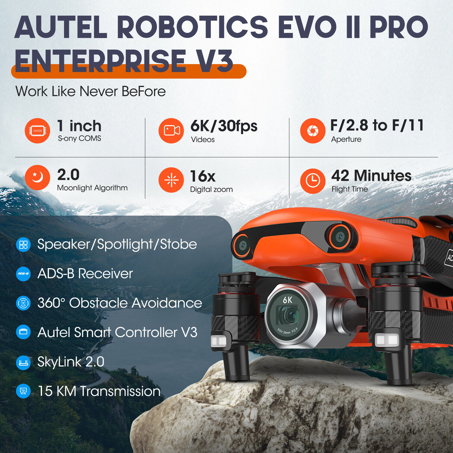 - 🏆【2023 NEWEST VERSION 3 – COMPACT. VERSATILE. POWERFUL】Autel EVO 2 Pro Enterprise V3 is equipped with Son-y’s new 1-inch CMOS image sensor, supporting up to 6K video resolution. The f/2.8 to f/11 adjustable aperture and max ISO 44000 enables the photographer to enhance their image control and creative freedom. The additional modular accessories help you meet a variety of specific use cases.