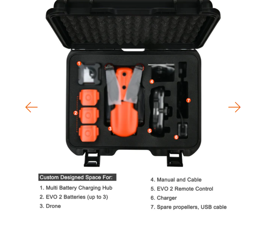 This military-grade EVO II hard case with a custom foam insert, designed specifically for EVO II series, holds your Aircraft and accessories. Each compartment of the insert is specifically designed to hold the EVO II drone, charging hub, controller, batteries, and more.